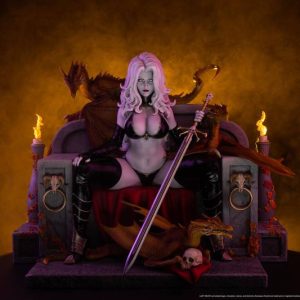 “Hell is mine!” Premium Collectibles Studio is proud to present the Lady Death 1:4 Scale Collectible Statue. Inspired by the artwork of acclaimed cover artist Frank Cho, The Lady Death statue measures 14” tall and 19” wide lounging on a stone throne surrounded by a trio of golden hued drakes. The throne is decorated with…
