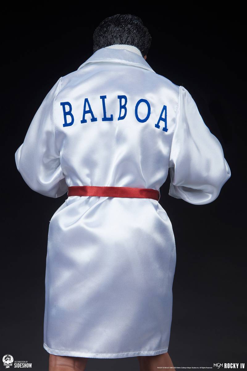 The Rocky IV 1:3 Scale Statue sports a mixed media costume with custom-tailored fabric elements to give collectors multiple fight-ready display options on their shelf. His red, white, and blue shorts feature a patriotic stars and stripes pattern and an elastic style waistband. The collectible statue additionally comes with a matching white towel and white robe that reads “Balboa” across the back, which can be displayed on the included rack when not on the figure. Rocky also has sculpted red boxing gloves and sculpted white socks and boots to complete his athletic look.