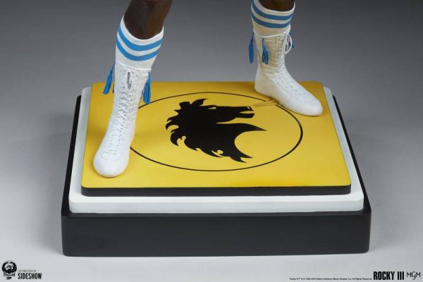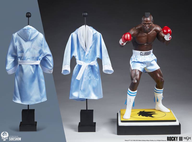 James “Clubber” Lang steps into the ring in this extremely detailed and lifelike 1:3 scale collectible statue based on actor Mr. T’s appearance as the antagonist in Rocky III. The World Heavyweight Champion boxer measures 27” tall standing on a 13” wide black, yellow, and white boxing ring base detailed with the Italian Stallion logo in the center. Lang strikes a wide and intimidating stance, ready to stop Rocky Balboa in his tracks on his way to the top.