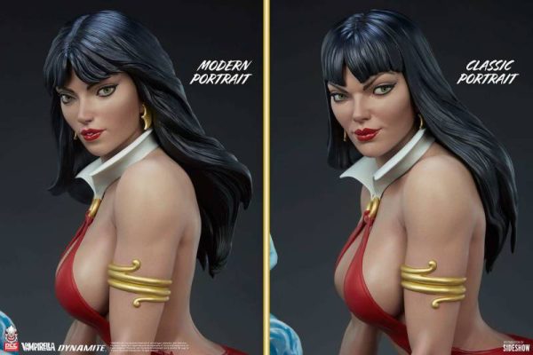 The Vampirella Statue is fully sculpted and features two unique headsculpts to capture Vampi’s classic and modern era appearances. Her classic portrait features a more mischievous expression framed by dramatically arched brows and sleek, stylized bangs, giving her an air of sinister seduction. The modern portrait has a softer, more flirtatious expression with gently parted lips and feathery bangs that give her hair a more volumized look. Vampirella’s signature red costume is accented with a high white collar and gold jewelry accents, including her armband, bracelets, and earrings. A pair of glossy high-heeled boots completes the vampire’s enthralling ensemble, proving this daughter of Drakulon is beautiful enough to make even a dead heart beat.