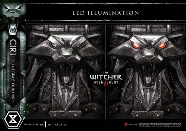 The base, inspired by the School of the Cat, features a slain Wild Hunt hound and the glowing red eyes of the cat, illuminated by LEDs, drawing you into the world of the Northern Kingdoms.